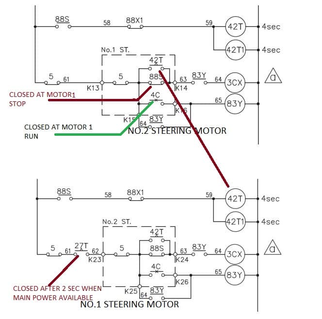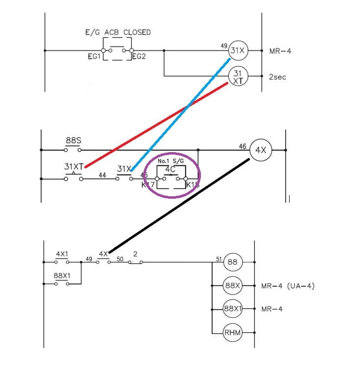 If the ship experiences a blackout, standby generators are unavailable, and the emergency generator is running with the ESB ACB closed, the 31X relay will turn ON, and its contact will close. After 2 seconds, the 31XT timer contact will close. At this time, with no power from the MSB, the No.1 steering will stop, and the No.1 motor starter’s 4C contact will be de-energized. If the 4C contact is NC, the No.2 motor will start automatically. The drawing indicates that NO is required for auto-start, which is incorrect.