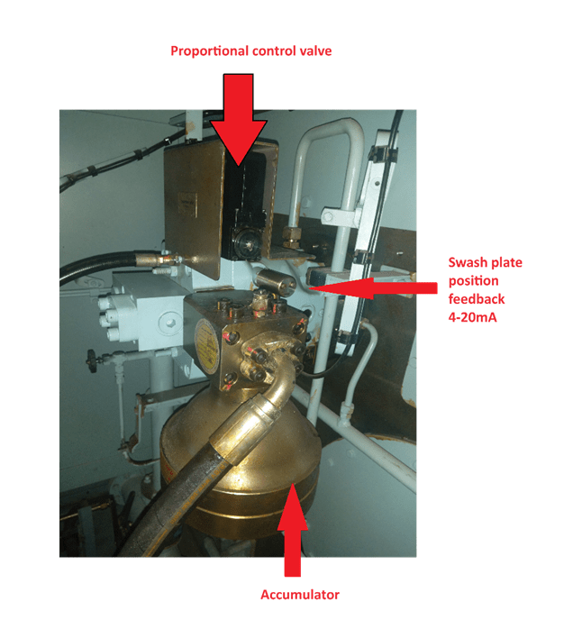 Engine driven pump တွေက အပေါ်မှာဆိုခဲ့သလို Axial piston pump အမျိုးအစားတွေ ဖြစ်ပါတယ်။ အဲဒီ Pump တွေရဲ့ Swash plate position ကို ACU MPC တွေက proportional valve တွေက တဆင့် Control လုပ်ပါတယ်။ Hydraulic oil pressure ကို တည်ငြိမ်ပြီး အတက်အကျ နည်းစေဖို့ Nitrogen ဖြည့်သွင်းထားတဲ့ Accumulator တွေကို pump outlet တွေမှာ တပ်ဆင်ထားပါတယ်။ Engine rotation ကနေ gear wheels တွေနဲ့ pumps တွေကို ချိတ်ဆက်ပြီး လည်ပတ်စေတာမို့ hydraulic flow က Engine speed ကိုရော၊ swash plate position ကိုရော မူတည်နေပါတယ်။ ပြီးတော့ Engine က Ahead / Astern direction နှစ်မျိုးလုံးနဲ့ သွားနိုင် တာ ဖြစ်တဲ့အတွက် pump တွေကလည်း engine direction ပေါ်လိုက်ပြီး ပြောင်းပေးရပါမယ်။ ဒါတွေ ကို ACU က ထိန်းချုပ်ပေးတာ ဖြစ်ပါတယ်။