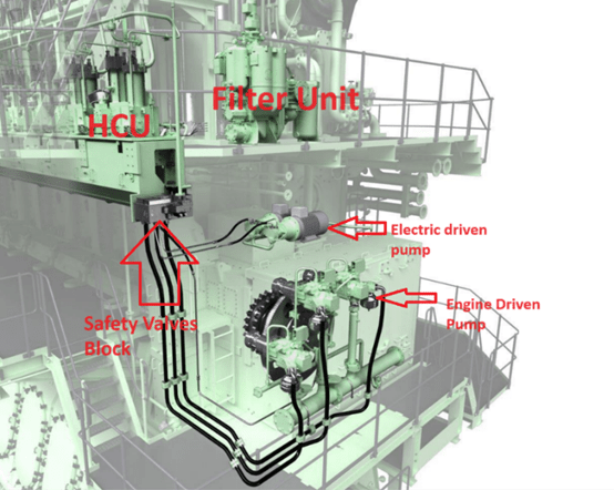 ME engine ရဲ့ Hydraulic System က Electronically Controlled Mechanical hydraulic System ဖြစ်ပါတယ်။ Engine ရဲ့ Fuel oil injection၊ exhaust valve operation တို့ကို Engine Control System က Hydraulic power ကို သုံးပြီး ထိန်းချုပ်တာဖြစ်ပါတယ်။ Hydraulic oil အတွက် System lubricating oil ကို သုံးထားပြီး လိုအပ်တဲ့ hydraulic oil ကို Hydraulic Power Supply Unit က ပေးပို့ပါတယ်။