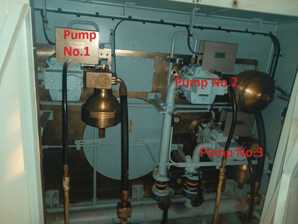 Engine driven pumps တွေအကုန်လုံးက ရွယ်တူတွေ ဖြစ်ပြီး Pump တစ်လုံး အလုပ် မလုပ်နိုင်တဲ့အခါ ကျန် နှစ်လုံးက Engine load 66% ထိ Hydraulic power supply ပေးနိုင်အောင် စီမံထားပါတယ်။ တကယ်လို့ electric power failure ဖြစ်လို့ swash plate ကို control မလုပ်နိုင်ခဲ့ရင် swash plate က Maximum ahead direction ကို ပြောင်းနေမှာ ဖြစ်ပါတယ်။