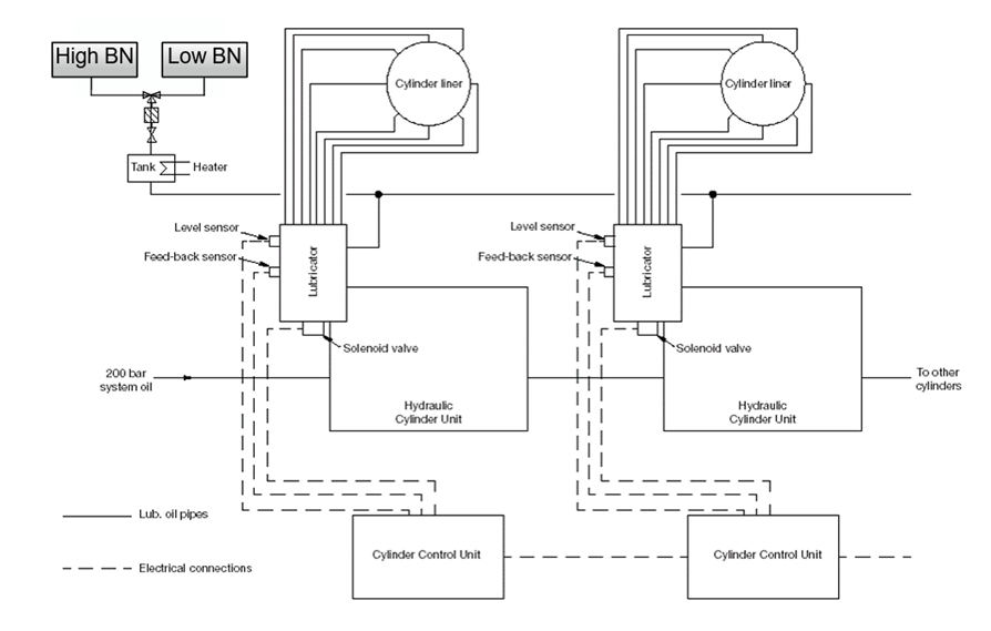 In the new systems, hydraulic pressure ensures the lubricator operates, and the feedback sensor confirms its activity. However, if lubrication oil does not enter the lubricator, the system might mistakenly think the lubricator is working, but the cylinder lubrication oil might not be reaching the cylinders. To address this, a small tank with a level switch is installed at the lubricator’s inlet to detect whether cylinder lubrication oil is being supplied.