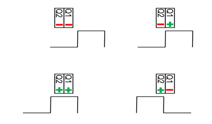 The rotating part of the encoder includes a semi-circular ring and a gear wheel with 360 teeth, as previously described. The encoder is equipped with two Quadrature sensors. These sensors detect the gear teeth and are ON when they register the presence of a gear tooth. Since the gear wheel has 360 teeth, the distance between each gear tooth is 1 degree. Figure 77 shows that the two Quadrature sensors can detect increments as small as 1 degree, with detailed measurement capability extending up to four positions per degree.