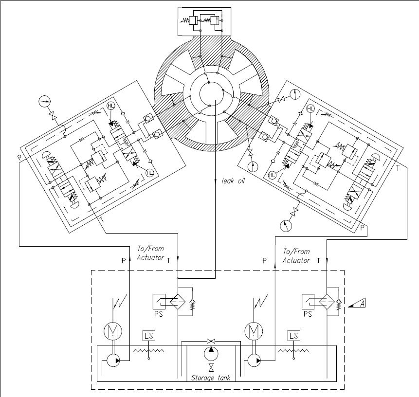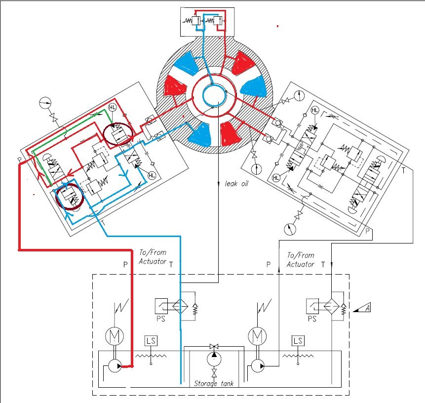 ခု အပေါ််ကပုံကတော့ Solenoid valve တွေ Energized မ ဖြစ်တဲ့ အခြေအနေ Neutral Position ကို ကျွန်တော် Trace လိုက်ထားတာပါ။ Supply oil တွေကဟာ P ကနေ ဝင်လာပြီး Main Directional Control valve နဲ့ Lock Valve တို့ဆီ ရောက်လာပါ။ Main Directional valve က Solenoidတွေ Energized မဖြစ်တဲ့အတွက် Center Position ရှိနေမှာ ဖြစ်သလို Lock valve ကလည်း Spring အားနဲ့ Center position မှာ ရှိပါမယ်။