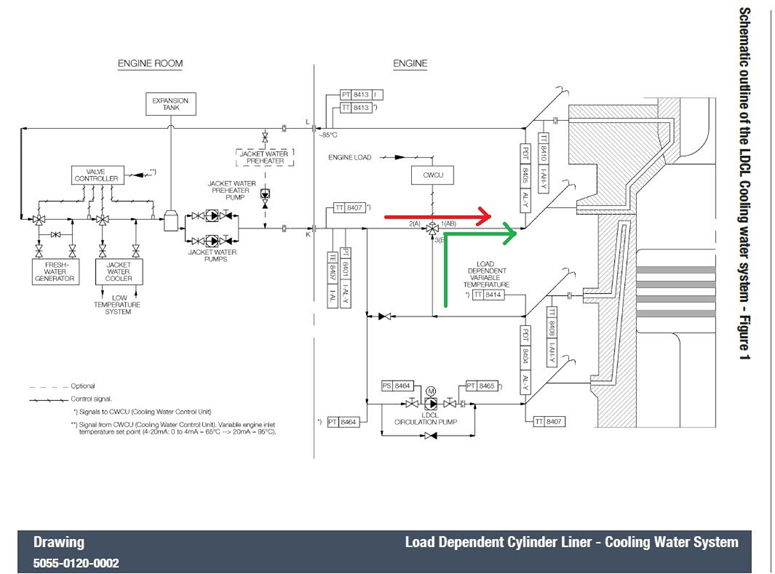 In Figure 2, the normal jacket water inlet and outlet are shown in blue. In the picture, you can see the 3-way valve controlled by the CWCU MPC. This valve adjusts the Liner Temperature (TLDVT). According to Figure 2, the 3-way valve is open from 3B to 1AB. At this time, the LDCL circulation pump is stopped.