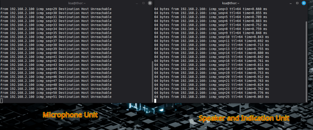 Since the IP addresses of the devices were known, a computer was connected to the PoE switch and a ping test was performed. The two indicator units responded normally, but the microphone unit did not respond. To rule out a cabling problem, the LAN cable connected to the microphone unit was checked and found to be in good condition. Based on these checks, the fault was determined to be a defective microphone unit.